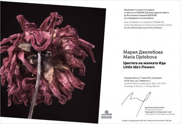Фотографката Мария Джелебова (http://mariadjelebova.com/) има удоволствието да ви покани на откриването на своята изложба Мария Джелебова - "Цветята на малката Ида" в Галерия Върхове.